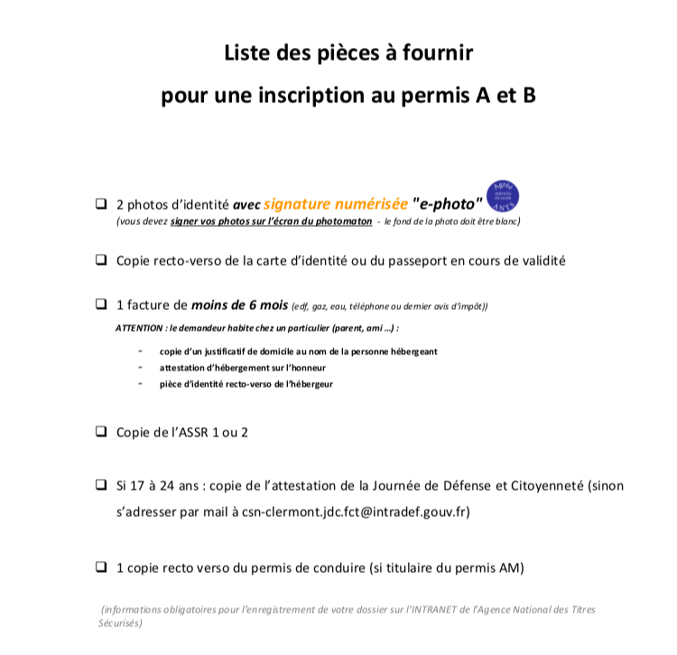 Liste des pièces à fournir pour inscription aux permis